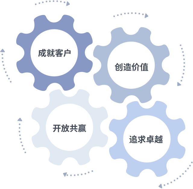 成就客户是一切决策的出发点,,创造价值是衡量所有工作的标准,,,追求卓越是我们做事做人的态度,,开放共赢是我们的格局也是最终的结果。。。价值观的齿轮环环相扣,,,,推动着组织里的每个人不断向前。。。